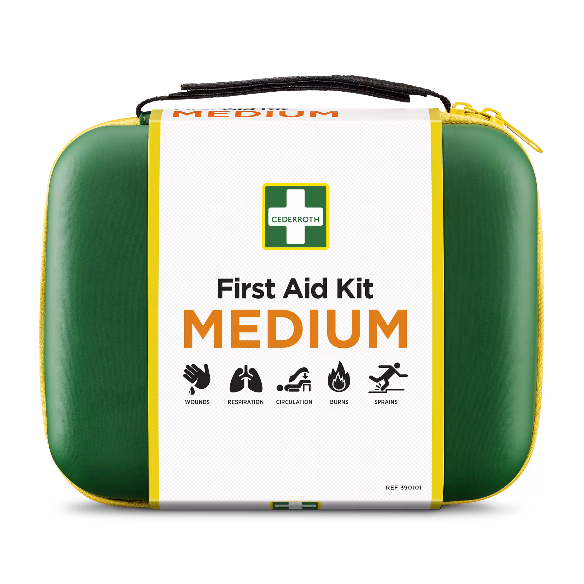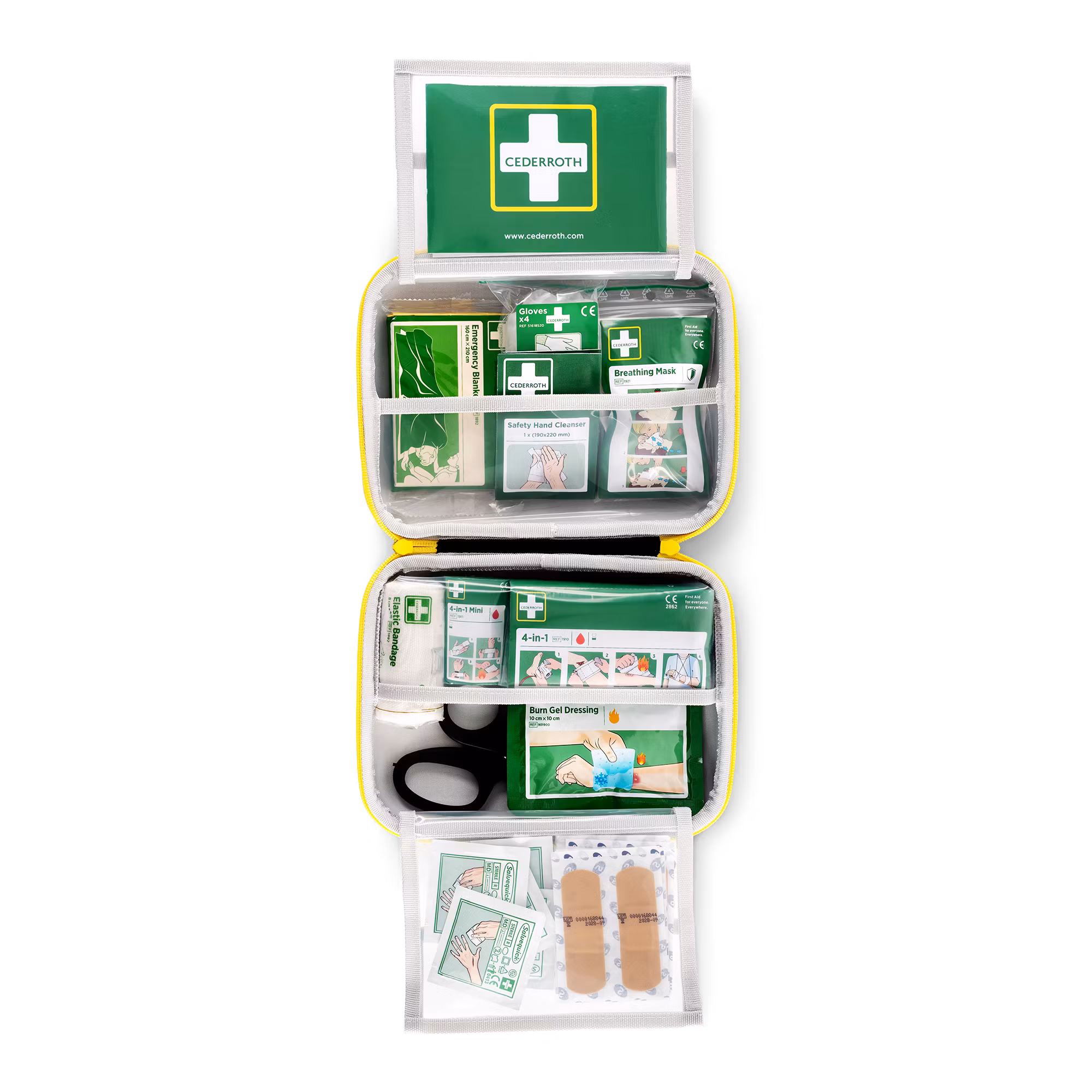 Första Hjälpen-kit i tjockt och slitstarkt material som skyddar innehållet mot damm och fukt. Praktiskt handtag med justerbart kardborreband.