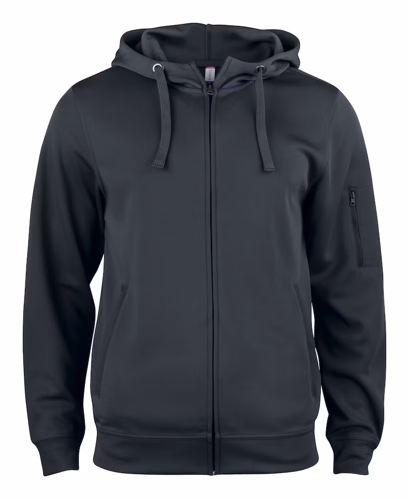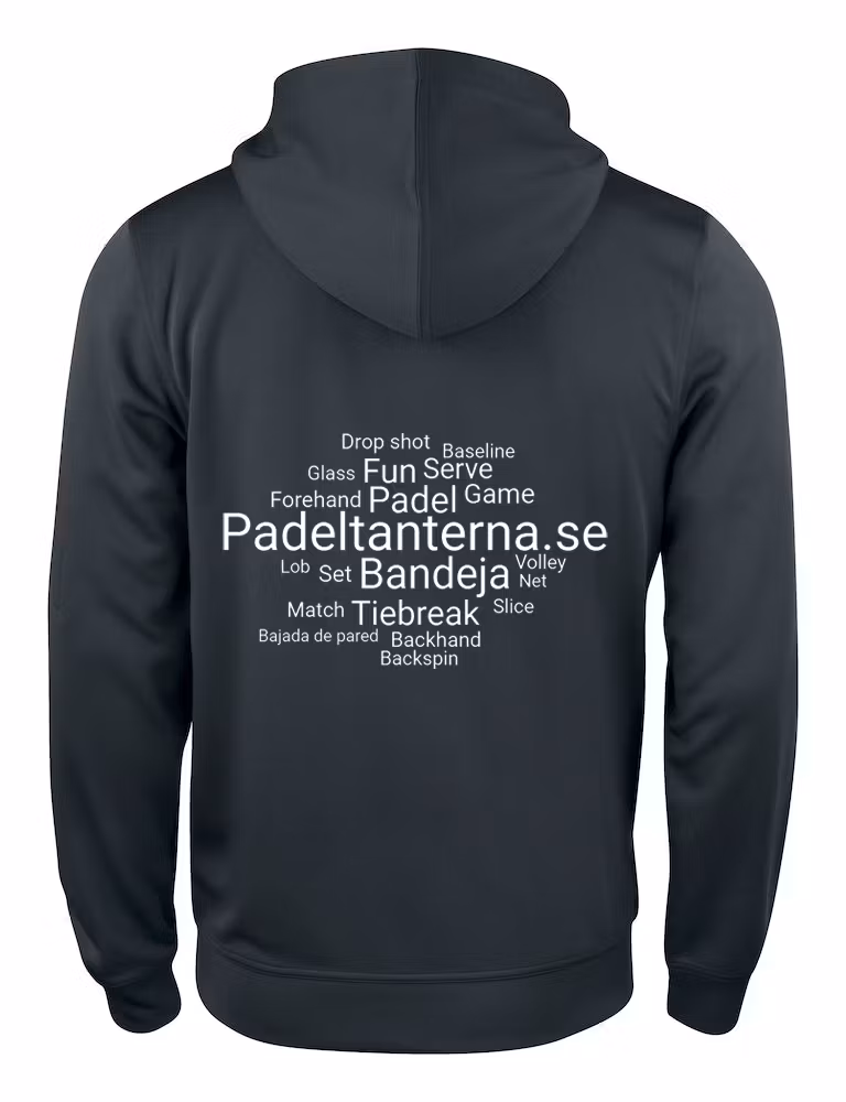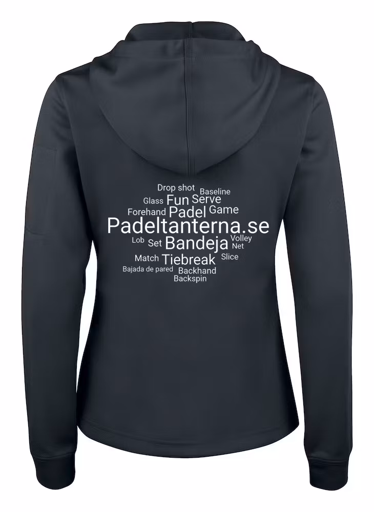 En Spun dyed hoodtröja med hel dragkedja. Ton-i-ton dragkedja framtill, på de två frontfickorna samt på ärmficka. Flata snören i huvan, fiskbensmönstrat nackband i halsen, ribbad mudd i ärmavslut och nedtill. Utrustad med smart lösning för hörlurar. Padeltanterna.se logotyp tryckt på rygg.