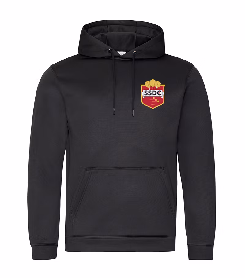 Sportig hoodtröja i mjuk polyester för barn tryckt med SSDC logotyp. Dubbelt tyglager i luva och känguruficka fram. Dold ingång och snoddar för hörlurar.
