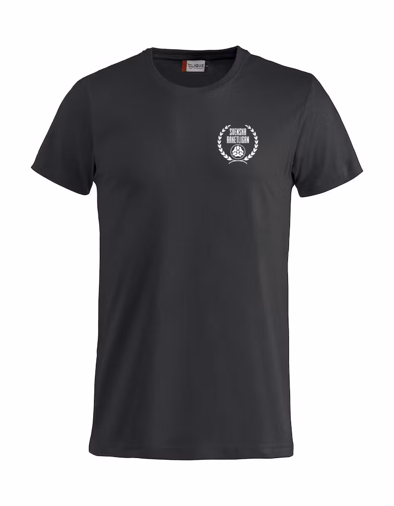 Svenska Raketligan t-shirt i svart färg. Tryckt med SRL logotyp på vänster bröst.