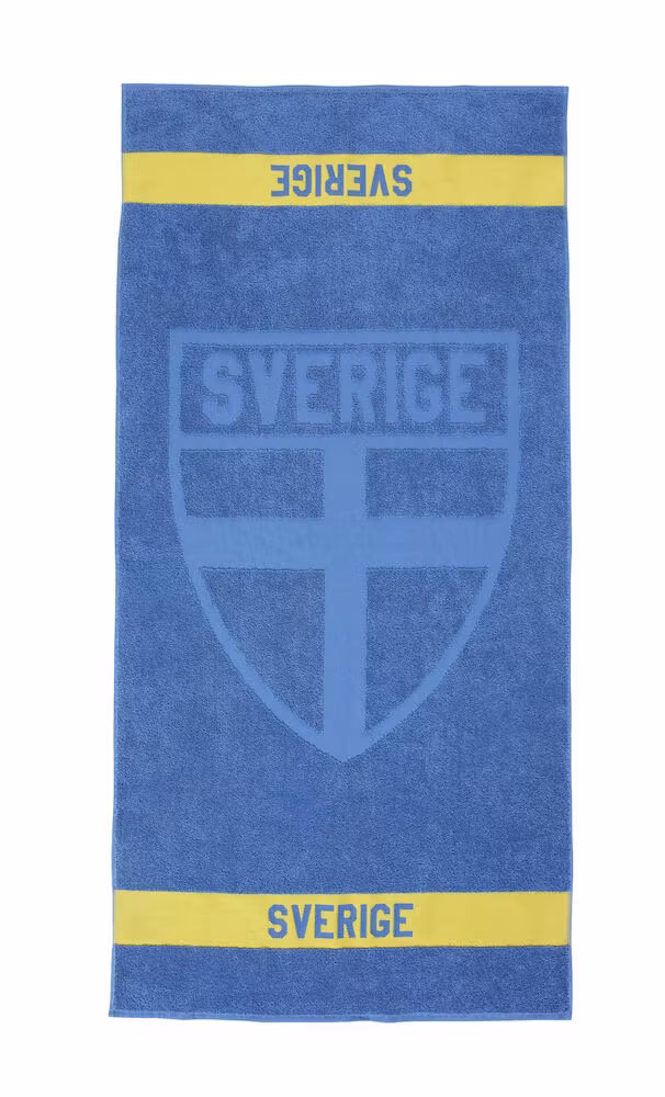 Sommarens självklaraste beachhandduk i 100% bomullsfrotté. Utskuren Sverigelogga mitt på och jaquardvävd bård. Storlek: 70 x 140 cm.