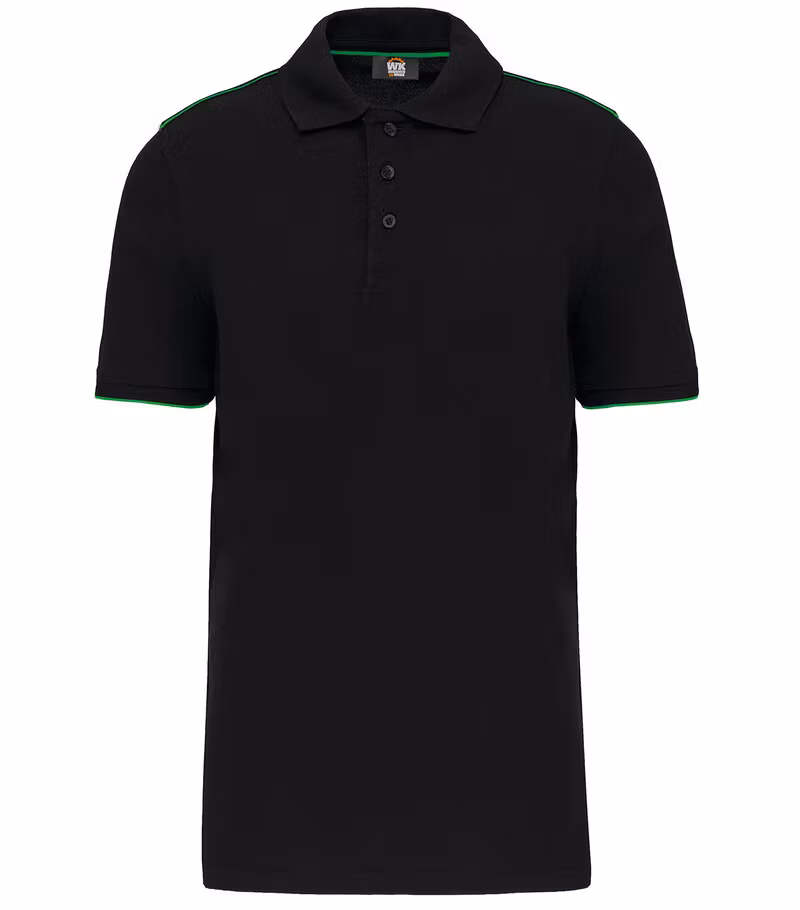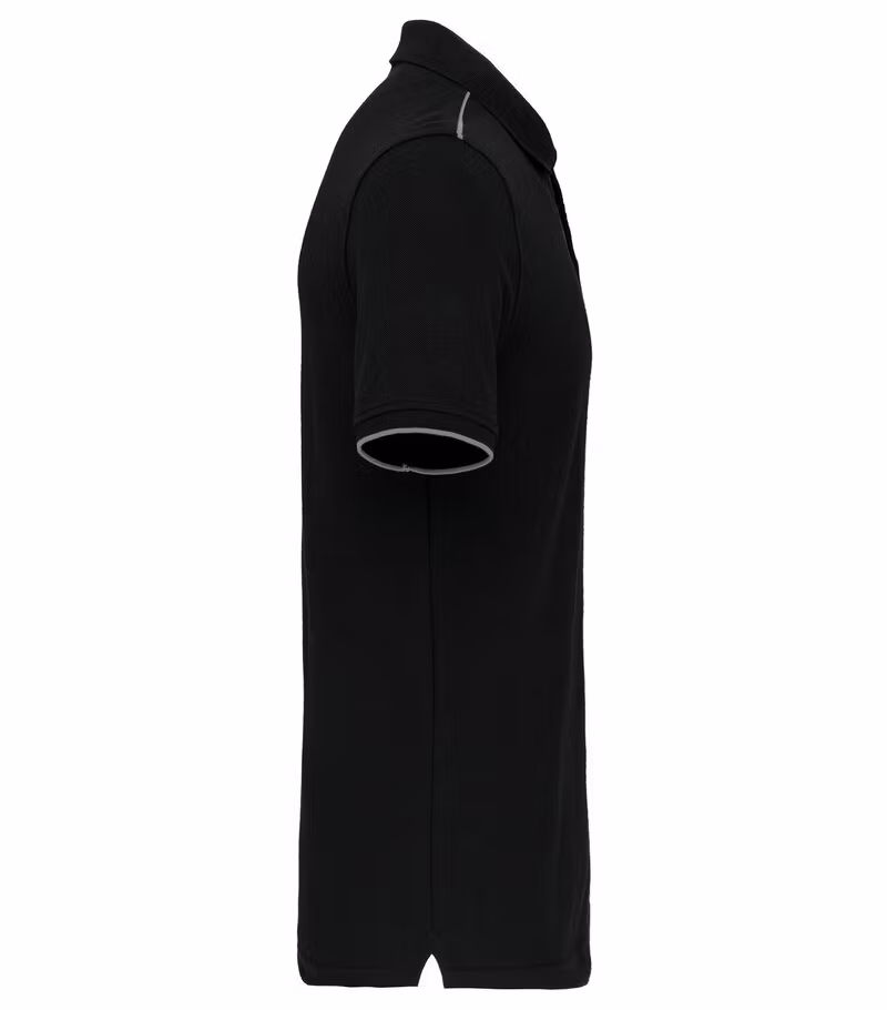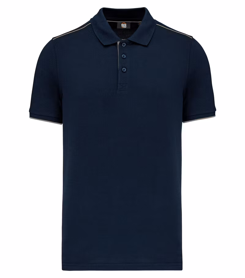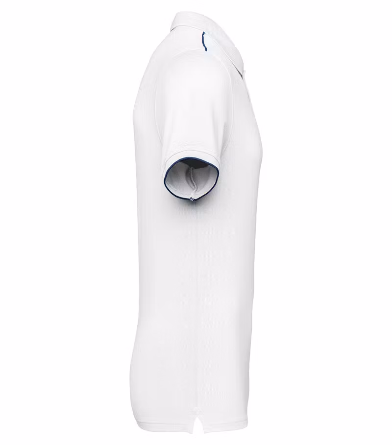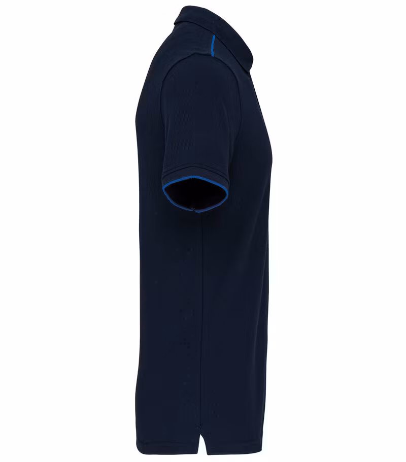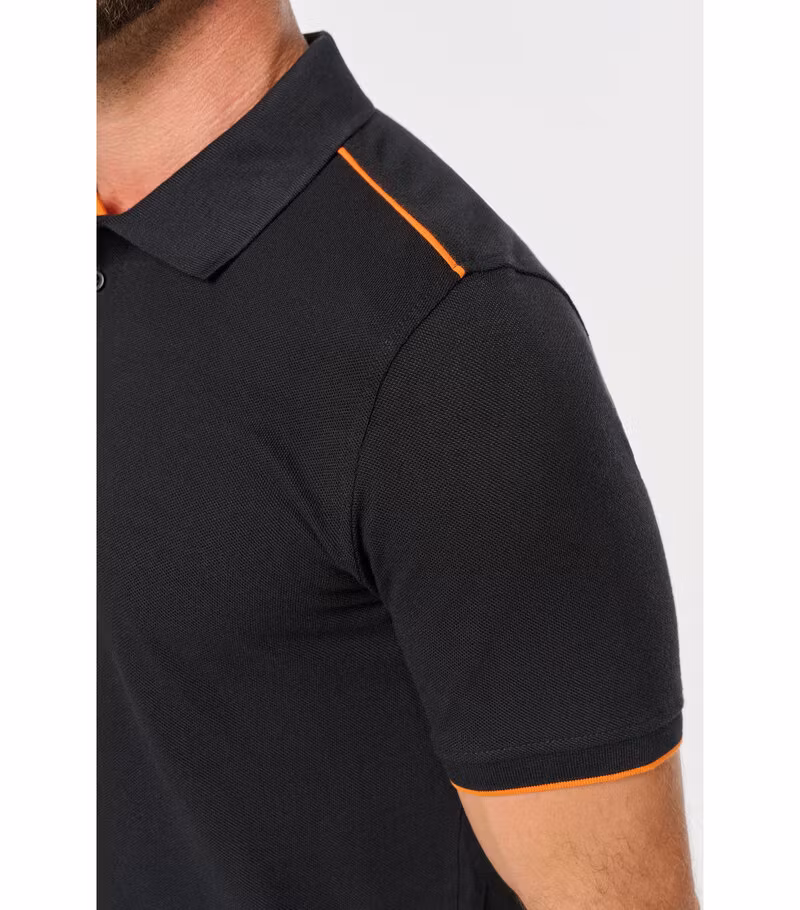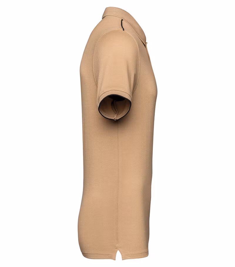 Pikétröja till herr tillverkad av polyester och kammad bomullspiké. Anti-pilling behandlad. Ribbstickad krage och ärmslut. Knappslå med tre ton-i-ton knappar. Tejpad hals i kontrastfärg. Kontrastfärg på knappslå, axlar, ärmslut och sidoslitsar. Dubbla översömmar på nederkant. Slits i sidorna. Kan tvättas i 60 grader.