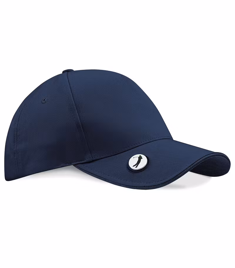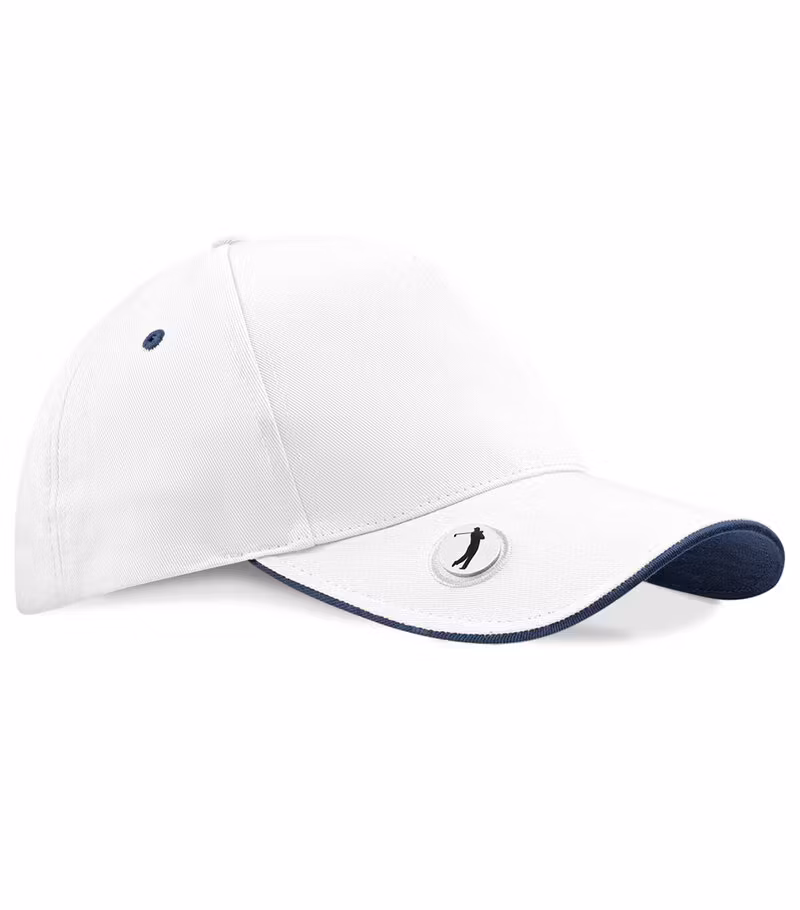 Golfkeps från Beechfield i 100% chinobomull med 5 paneler och böjd skärm. Coolmax 100% polyester svettband. UV-skydd upp till UPF50+. Sydda ventilationsöglor. Dold magnet som håller kvar bollmarkör.