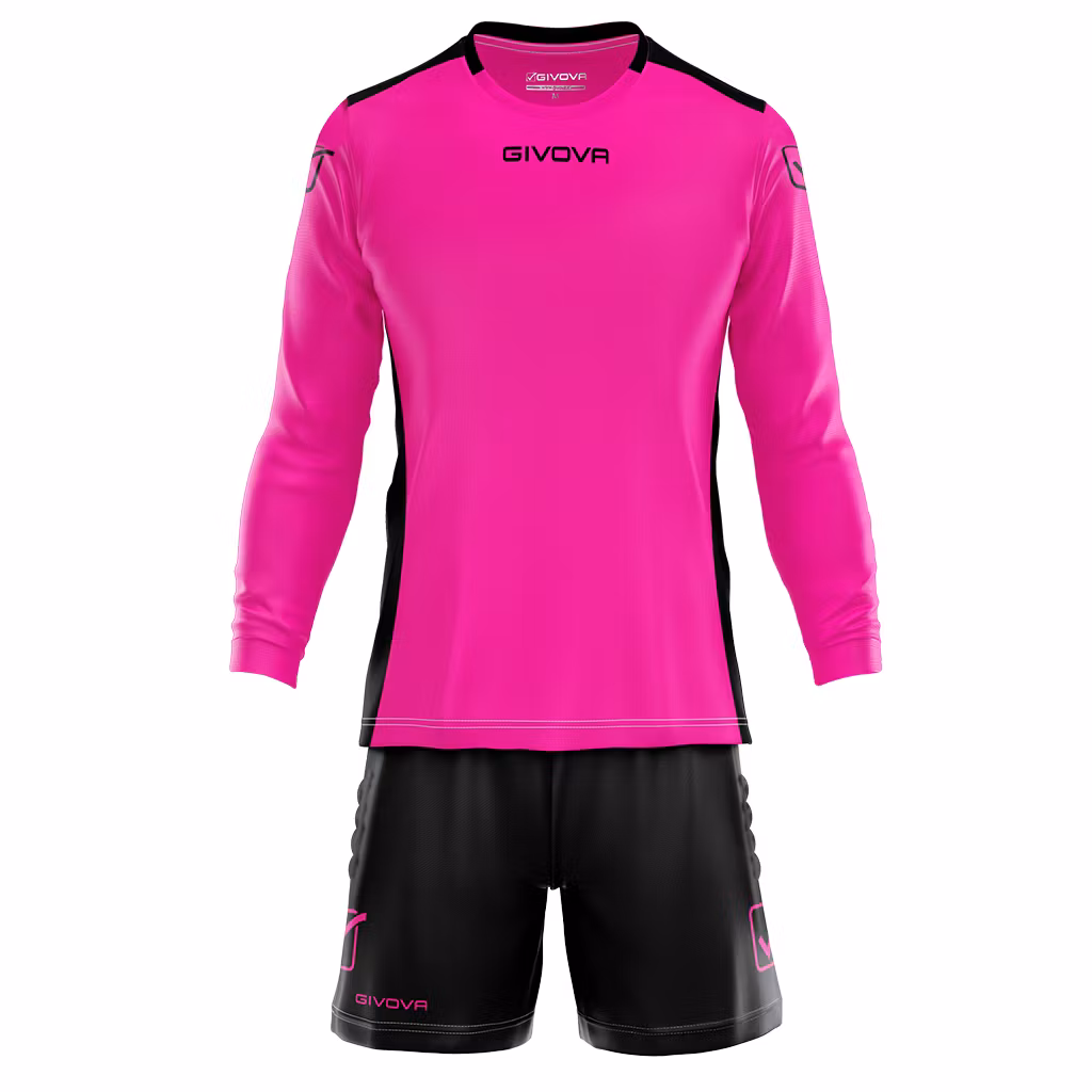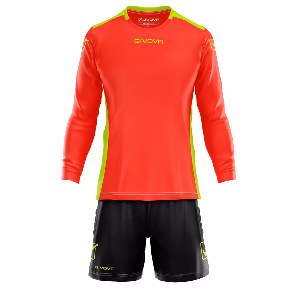 Målvaktsställ för fotboll från italienska Givova. Rundhalsad krage och muddar på armar och shorts.